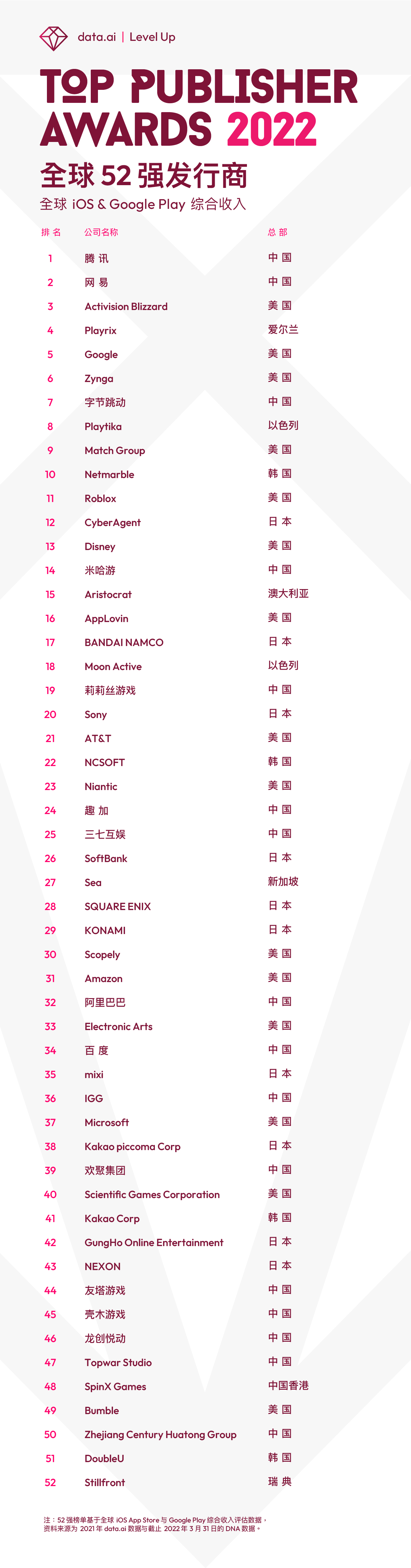 2021年是破纪录的一年,受疫情的影响和游览的约束,人们继续拥抱移动优先的生活方式,前十大移动商场的顾客每天在移动使用上花费了惊人的4.8小时。本年data.ai的全球52强发行商榜单也充沛印证了这一点,其间,游戏和交际使用发行商的数量不光占有榜单主导地位,排名也均完成大幅添加。