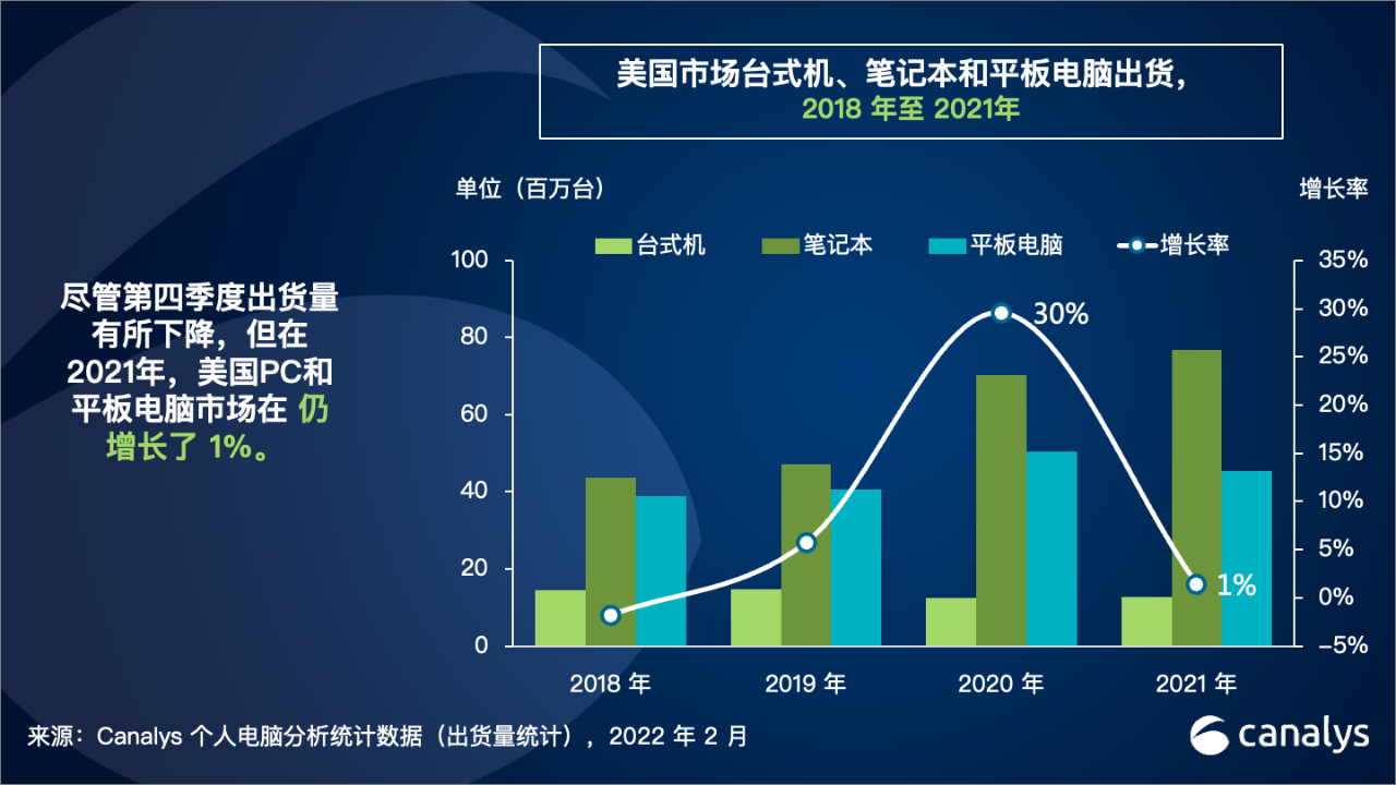 依据Canalys发布的最新数据,美国PC出货量(包括平板电脑)在 2021 年添加了1%,而2021年第 4 季度PC出货量则下降28%。整体而言,台式机、笔记本、作业站和平板电脑在上一季度的总出货量为 3380 万台。由于教育商场现已到达饱满,使得 Chromebook 销量跌落,致使笔记本出货量同比下降 28%,仅达 1750 万台。而消费需求的显着放缓,使得平板电脑出货量减缩 31%,为 1270 万台。比较之下,商业出资带来企业作业岗位的继续添加,促进台式机成为体现最为好的品类,添加9%,达360 万台。