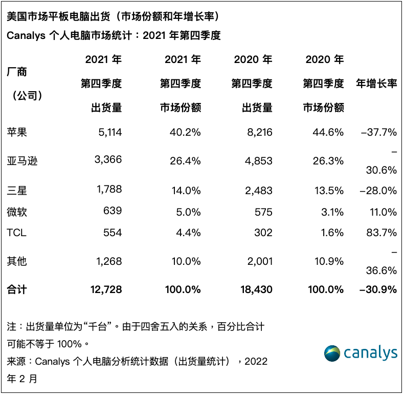 在平板电脑商场,苹果在第四季度和全年都占有了主导位置,到2021 年末, iPad 出货量为 1910 万台,但比较 2020 年下降 17%。亚马逊和三星别离以 1090 万台和 790 万台的出货量位居第二和第三,成为美国首要的安卓平板厂商。与 2020 年同期比较,这两者的假期时节需求都相对低迷。微柔和联想别离在 2021 年的平板电脑商场位居第四和第五。