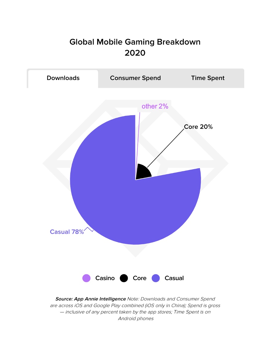《2021 年移动游戏商场陈述》的目标清晰反映了这些差异。休闲游戏在下载量方面遥遥抢先。它们在悉数的游戏下载量中占有 78%,硬核游戏占 20%,其他游戏占 2%。