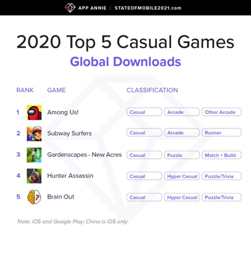 毫无疑问,2020 年最杰出的游戏便是 Among Us。它是 2020 年下载量排名第一的休闲游戏,均匀月活泼用户数排名第三。
